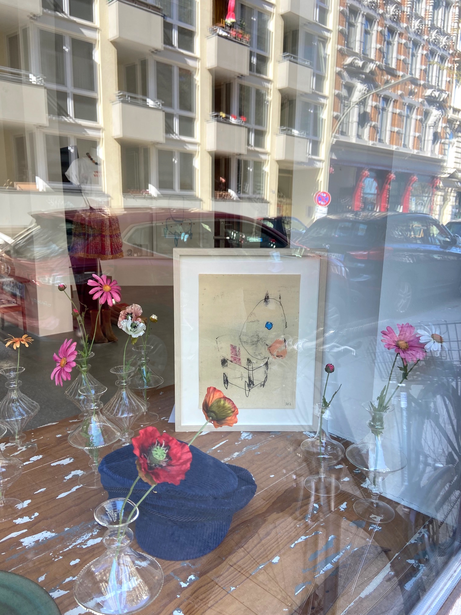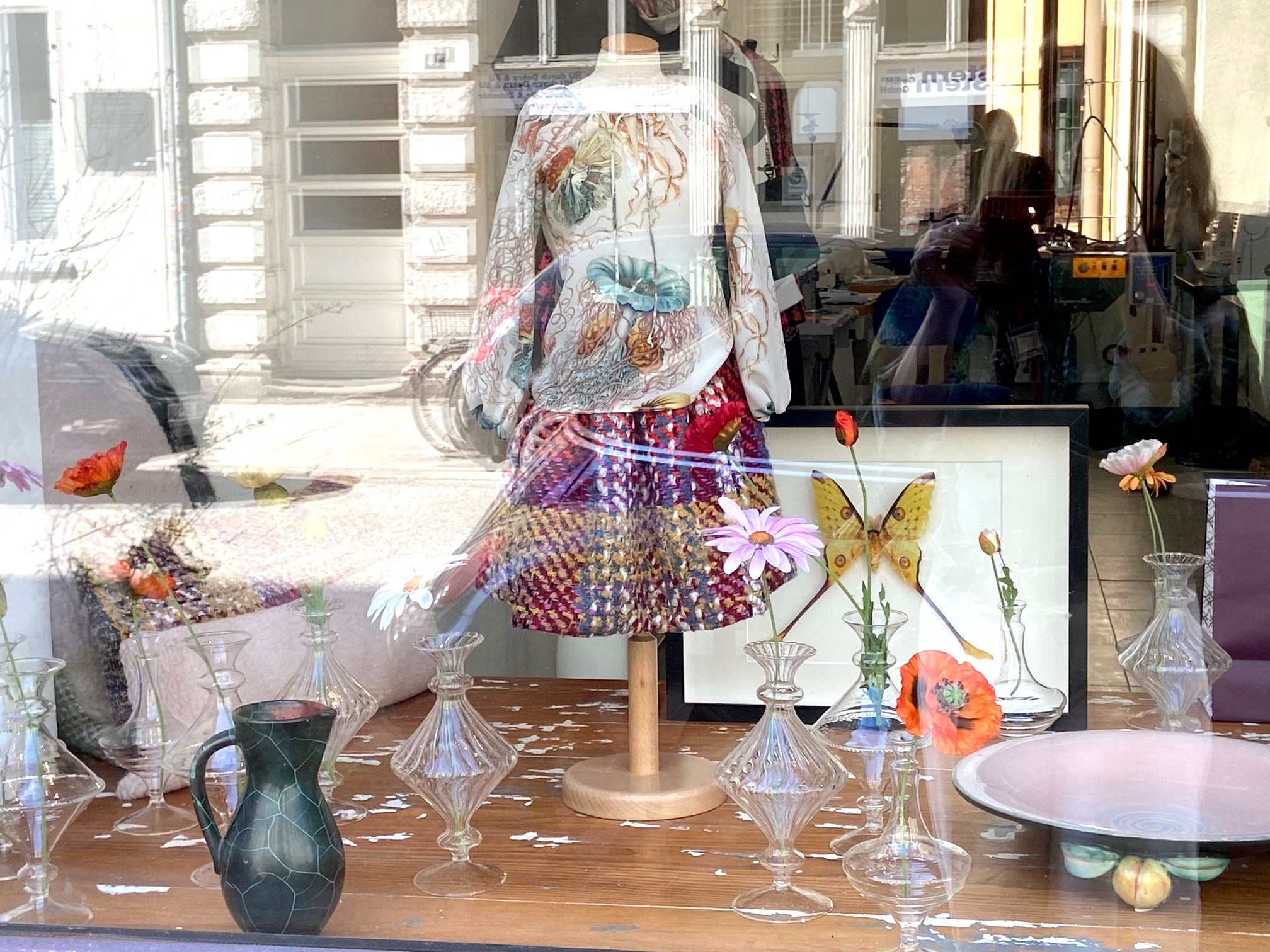 In Kampen auf Sylt ist es das Kapitänshaus mit den kleinen Fenstern unter dem Reetdach. In der Milchstrasse konnte man von der Fassade nicht auf den Salon dahinter schließen. Nun muss ich üben, Dekorateurin für die Frontscheibe zu sein. Die Straße hilft mir dabei, denn sie spiegelt sich in allem, die Gebäude von gegenüber, das geparkte Auto davor, selbst ich mit meinem Handy bin zu sehen.