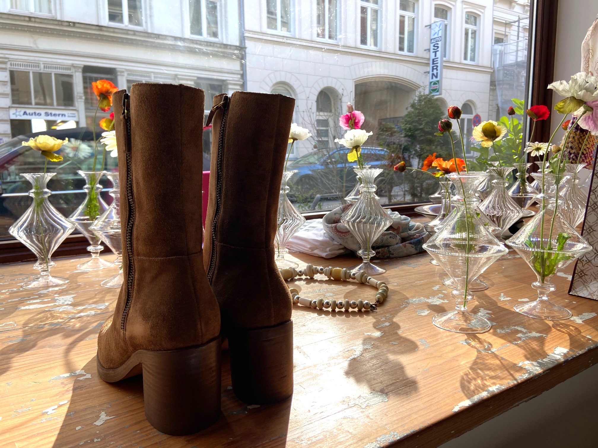 Ein paar Dinge muss ich noch lernen im Leben. Die meisten davon sind schwierig, fange ich mit den leichten an: ein Schaufenster dekorieren. Noch nie hatte ich ein Schaufenster. Meine Maxime war es, ein Geschäft zu besitzen, dass durch sein Innen lebt, entdeckt werden will und sich nach außen hin zurückhaltend, reserviert gibt.