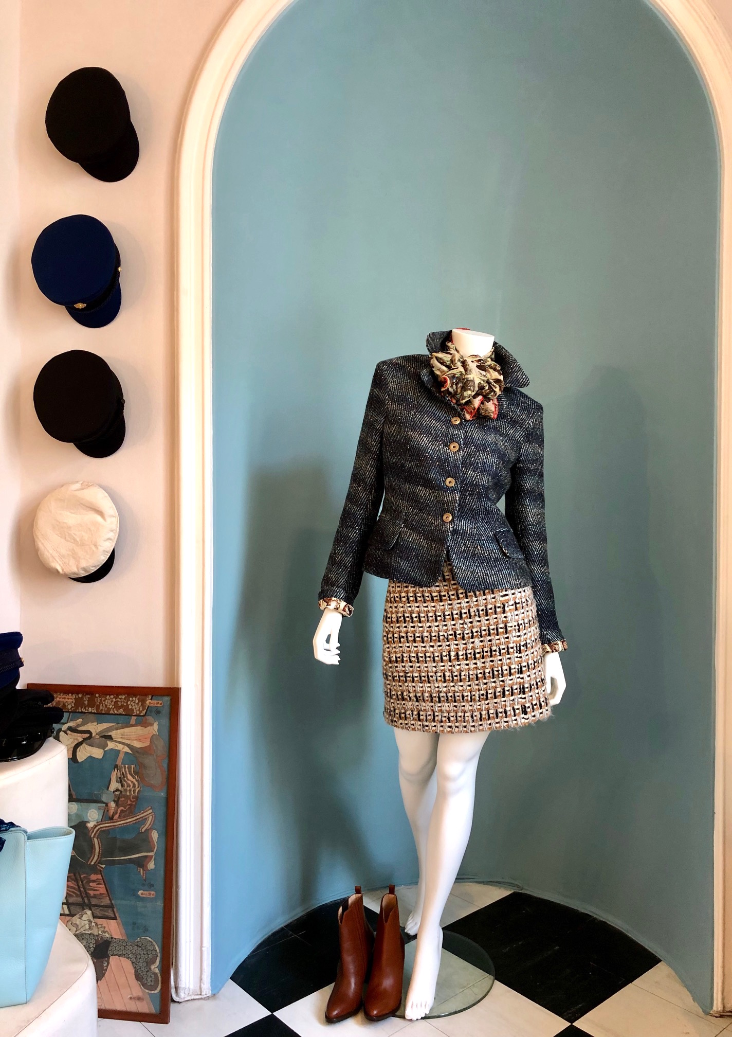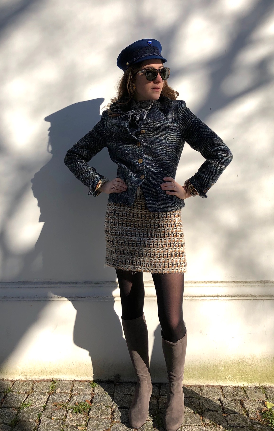 Nach dem kleinen Lunch gestern in der Sonne stand mir Toska für ein spontanes kurzes Fotoshooting zur Verfügung: Bouclé Blazer mit Jean de La Fontaine Illustration-Futter (€ 698), Doré Seidenbluse, Bouclé Rock in braun-beige und die grauen Stiefel von Taglia Scarpe. Dazu die royalblaue Seemannskappe und Sonnenbrille. Sehr stylisch! Solch ein Outfit funktioniert sowohl im Ski-Urlaub, wie auf Mallorca, auf Sylt oder zu einem sonnigen City-Spaziergang.