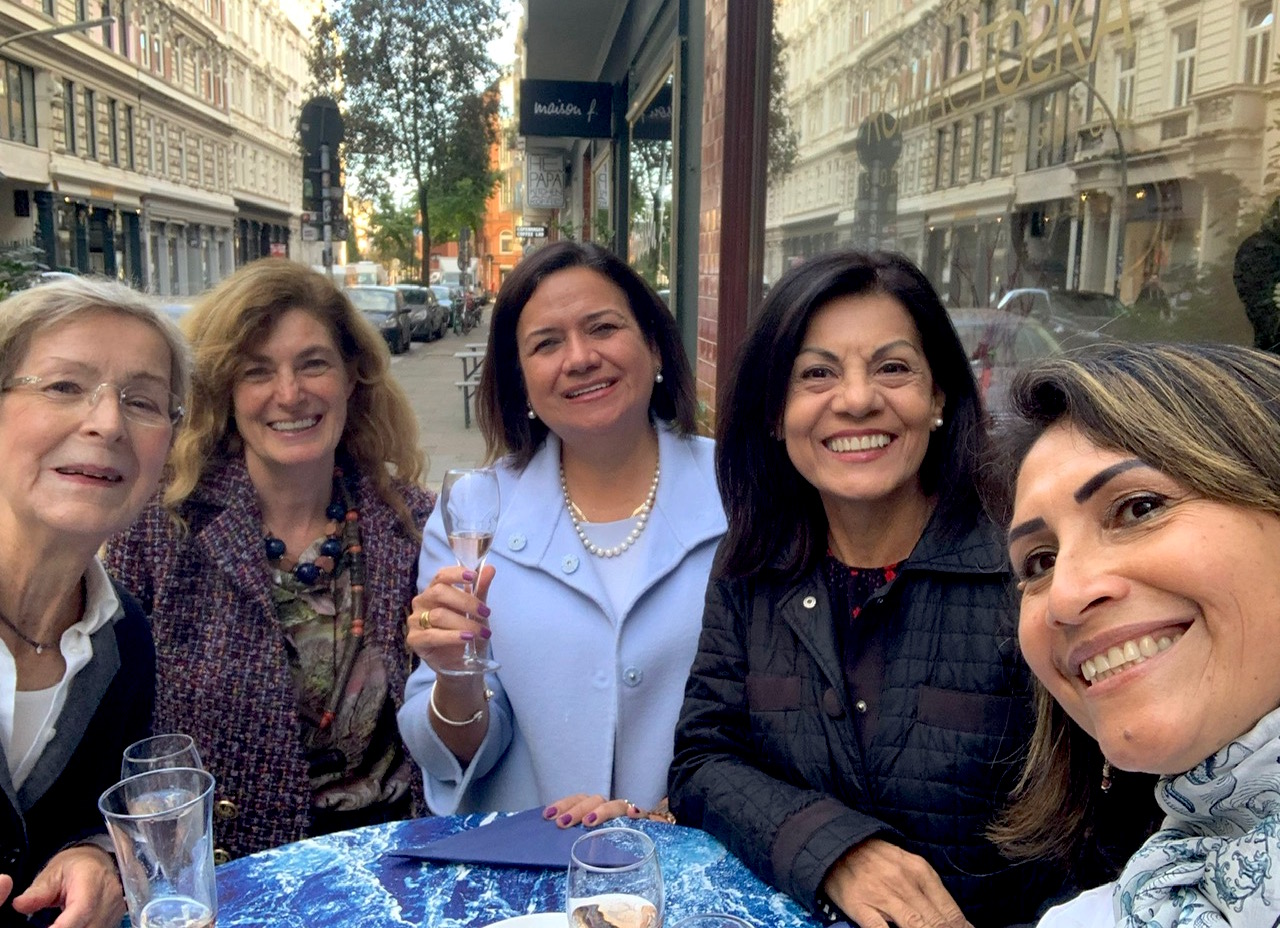 Es galt übrigens die G2 Regel für den Tag: Geimpft oder genesen und dann geht es auch ohne Maske drinnen. Was für ein entspanntes Gefühl. Getrunken und gegessen wurde vor der Tür. Am Schluss wurde es noch südamerikanisch mit den General-Konsulinnen aus Peru (Mitte) und Argentinien (rechts), Ana Peña Doig und Laura Ramirez Barrios.
