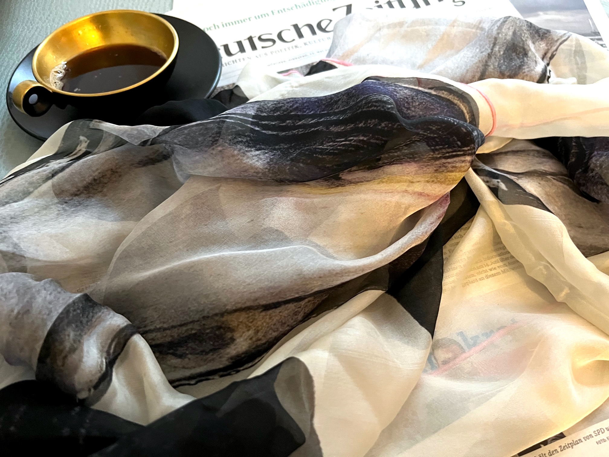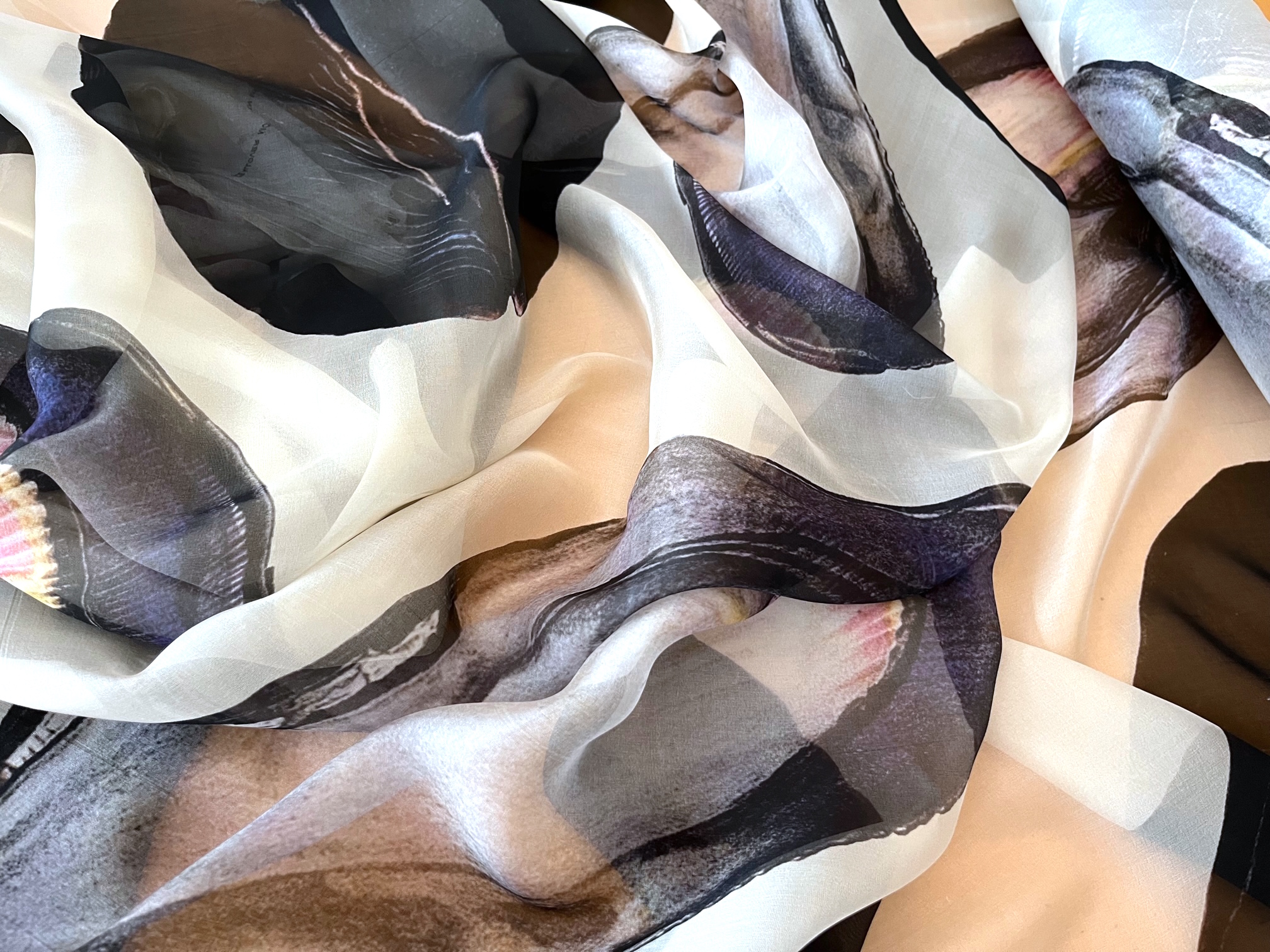 Gestern kam endlich der Seidenciffon aus Italien mit den großen Muscheln, ein duftiges Nichts das sanft durch die Hände gleitet. Das Tuch No.1 ist vergeben, ich trage das E.A (Épreuve Artiste), für alle anderen könnt Ihr beim Kauf Euren Zahlenwunsch abgeben.
