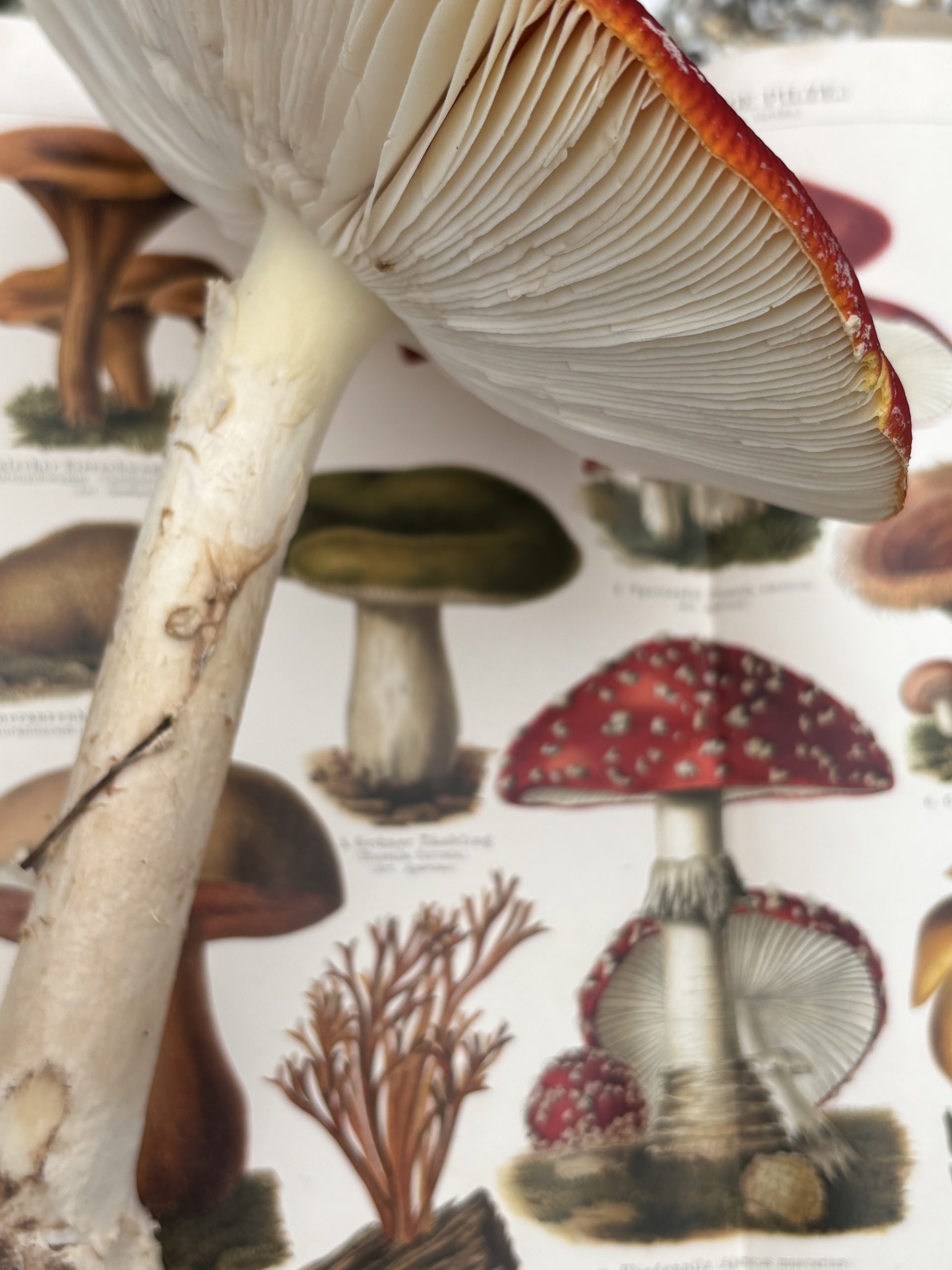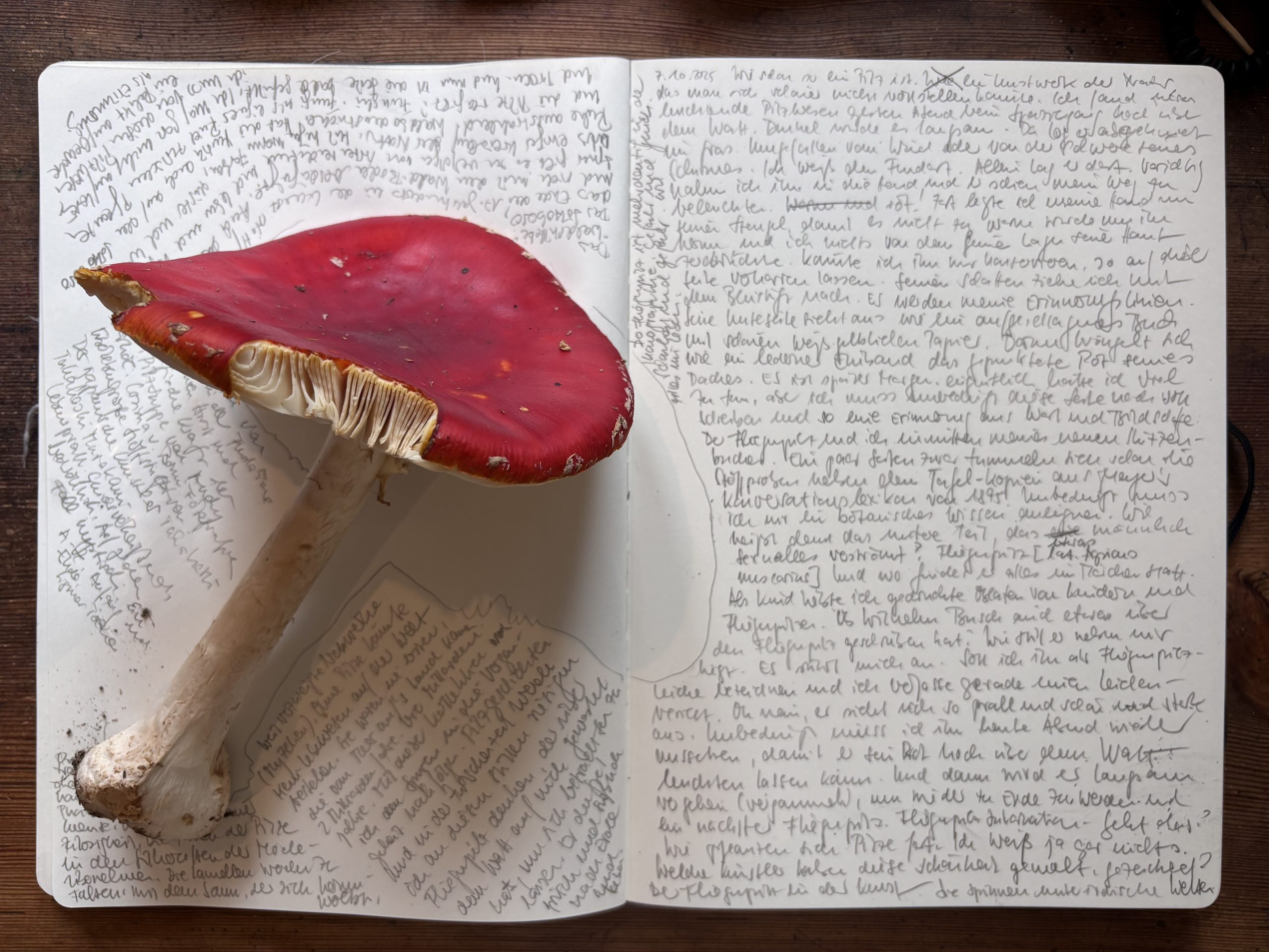 Mein Fliegenpilz ist keine Pflanze und ist kein Tier, er bildet sein eigenes Reich, das der Funga, wie die Wissenschaft erst spät (1969) erkannte. – Die Stunden vergehen, in denen ich meinen Fliegenpilz mit meinem Geschriebenen und frischem Wissen umkreise, mich mit ihm unterhalte und unmerklich eine zarte emotionale Beziehung aufbaue.