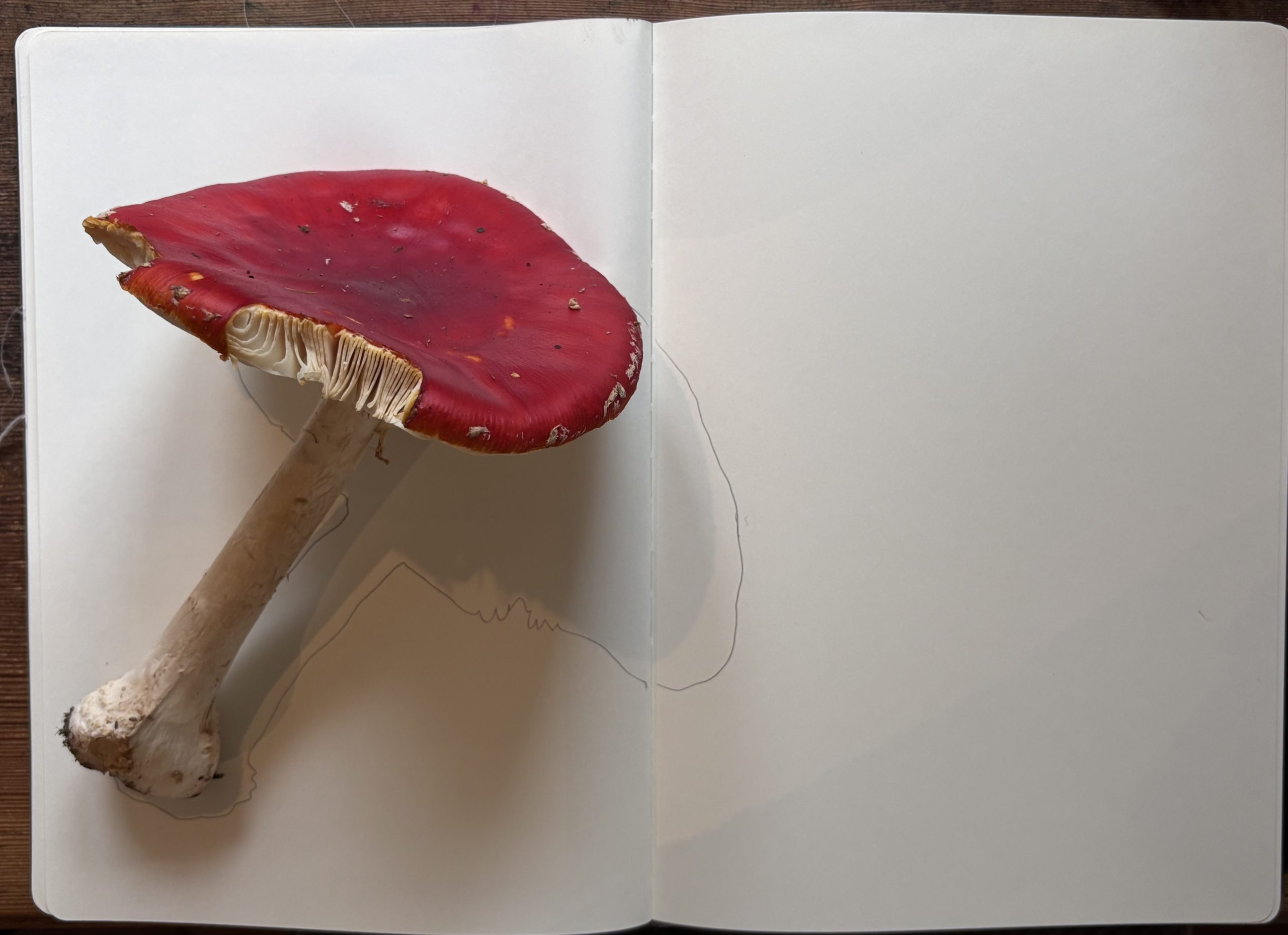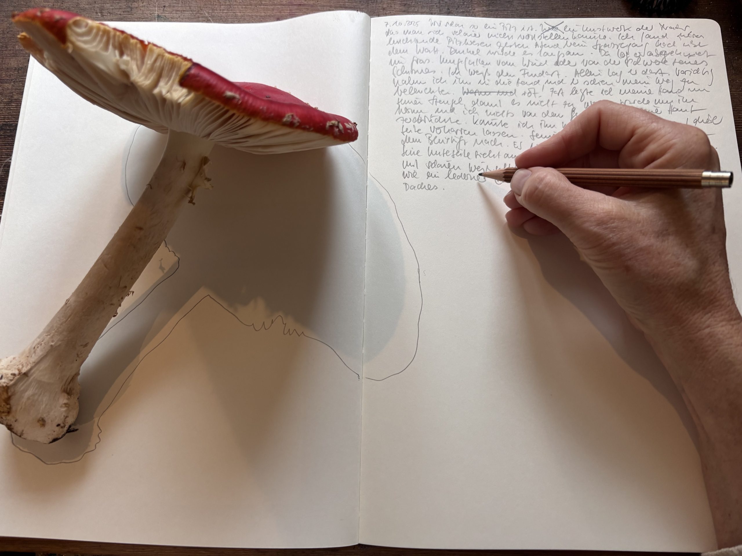 Kurz halte ich inne, dann fließt es förmlich aus mir raus. Dicht gedrängt reihen sich die Wörter und Sätze aneinander, schlängeln sich entlang der Schatten-Silhouette des Fliegenpilzes. Alles, was ich über Pilz weiß oder unbedingt herausfinden muss, notiere ich.