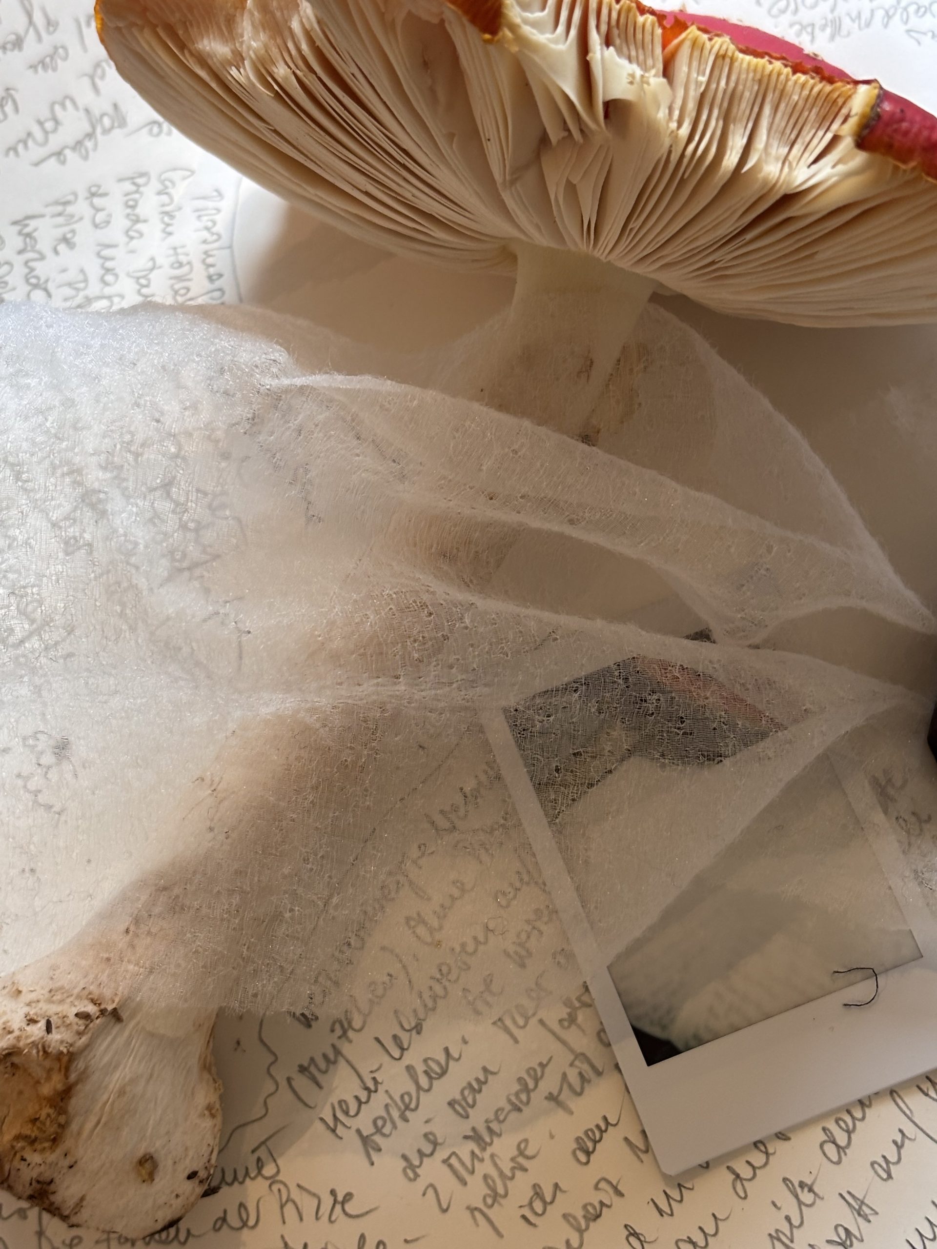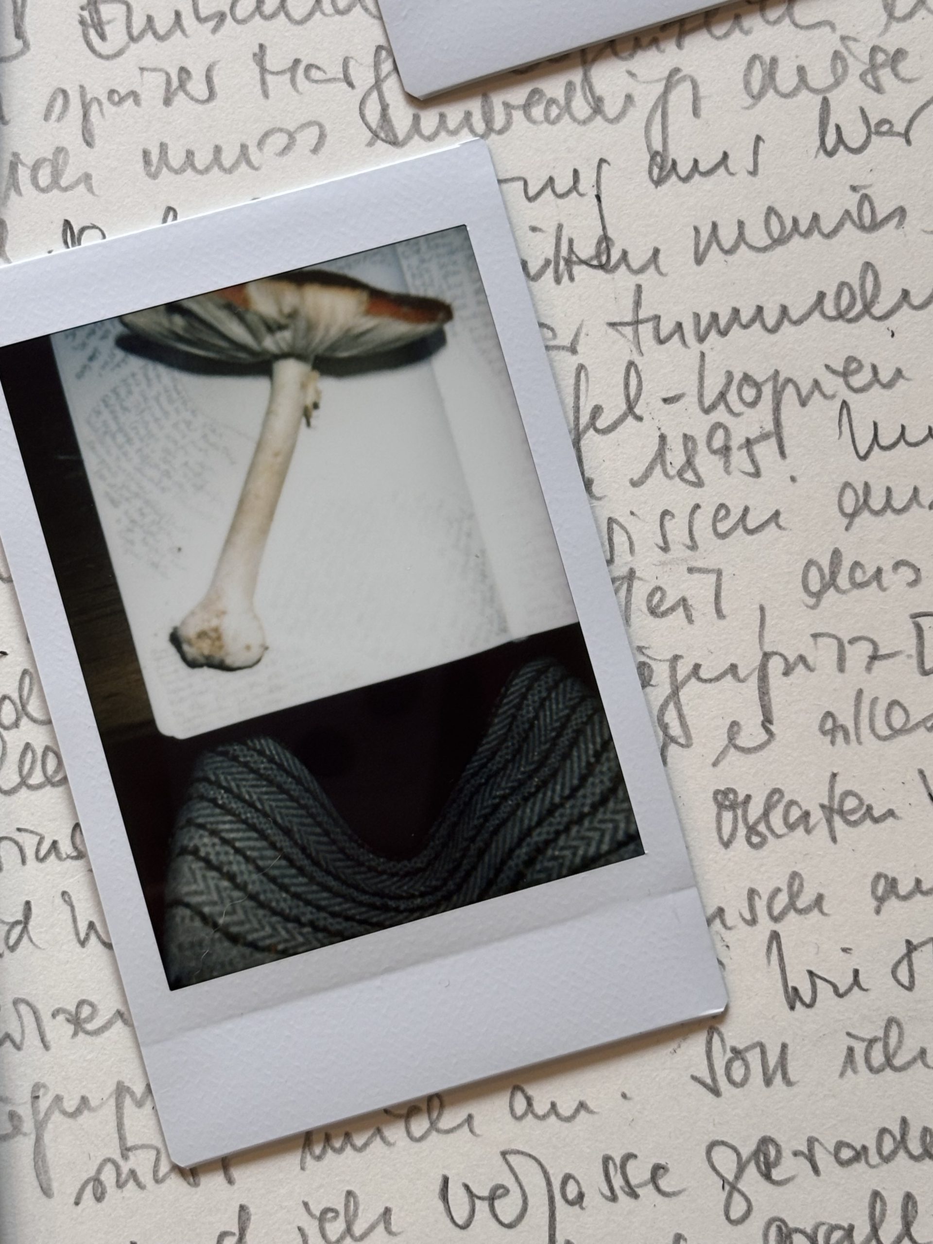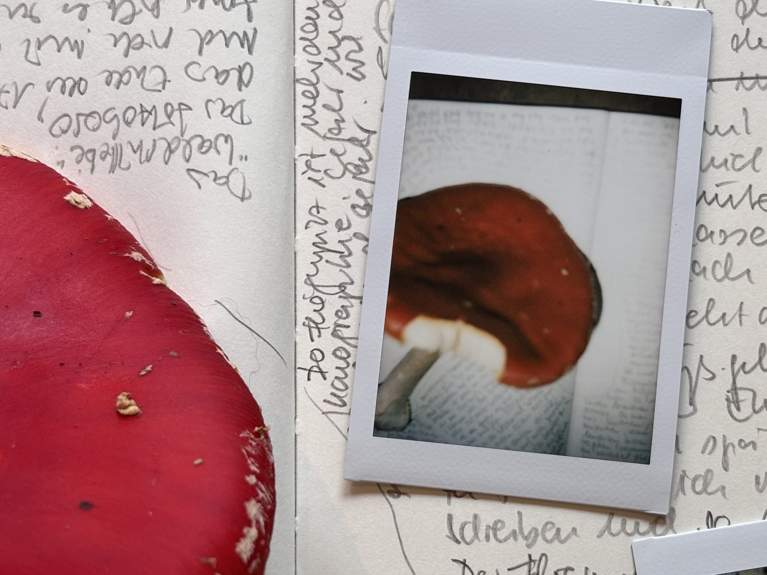 Ich mache ein paar Polaroids, wieder eine Bestandsaufnahme. Ähnlich dem Geflecht der Pilze geht meine Recherche hin-und-her, wächst in alle Richtungen. Welche Künstlerinnen und Künstler haben den Fliegenpilz als Motiv verwendete? Ich finde den Begriff des “Sottobosso” als Kunstgattung des 17. Jahrhunderts, das Stillleben des Waldbodens. Pilze waren die ersten, noch weit vor den Pflanzen, die aus dem Wasser aufs Land gingen, um Lebensmöglichkeiten für alle zukünftigen Spezies zu schaffen, auch für uns Menschen. Wir sprechen von einer Zeit vor mindestens zwei Milliarden Jahren.