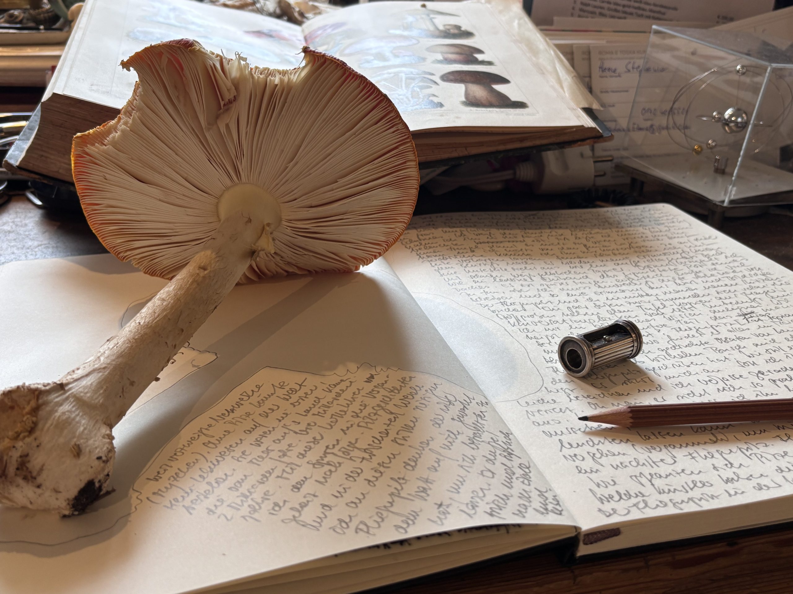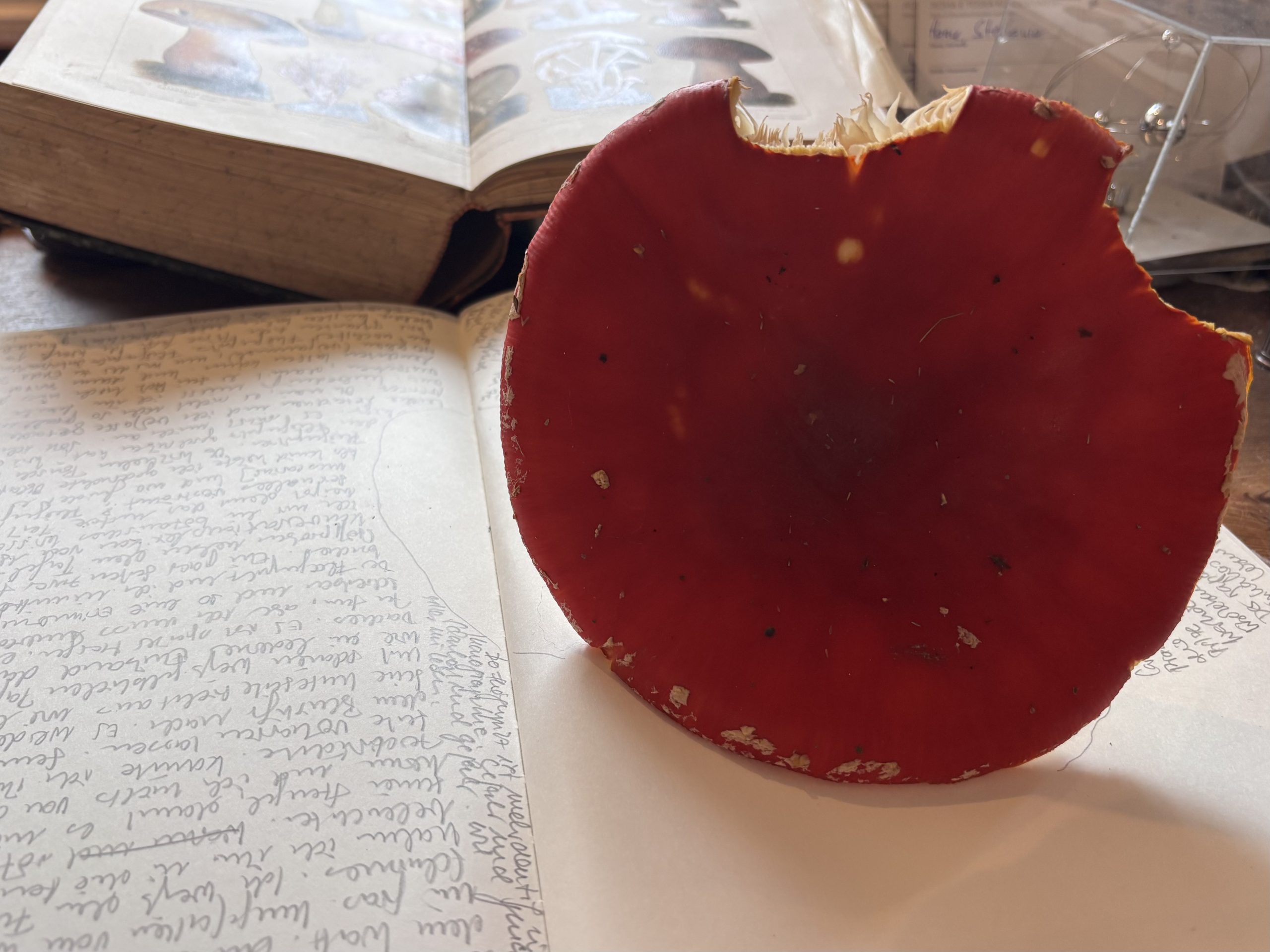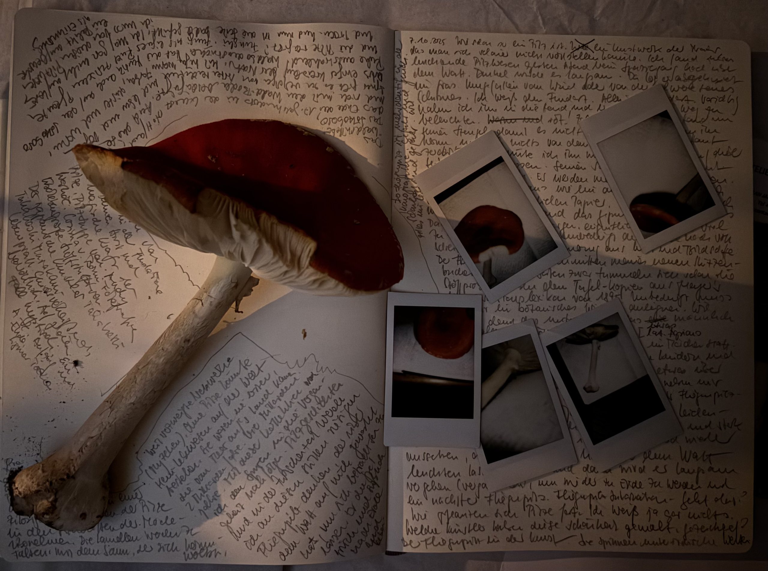 Ich mache ein paar Polaroids, wieder eine Bestandsaufnahme. Ähnlich dem Geflecht der Pilze geht meine Recherche hin-und-her, wächst in alle Richtungen. Welche Künstlerinnen und Künstler haben den Fliegenpilz als Motiv verwendete? Ich finde den Begriff des “Sottobosso” als Kunstgattung des 17. Jahrhunderts, das Stillleben des Waldbodens. Pilze waren die ersten, noch weit vor den Pflanzen, die aus dem Wasser aufs Land gingen, um Lebensmöglichkeiten für alle zukünftigen Spezies zu schaffen, auch für uns Menschen. Wir sprechen von einer Zeit vor mindestens zwei Milliarden Jahren.