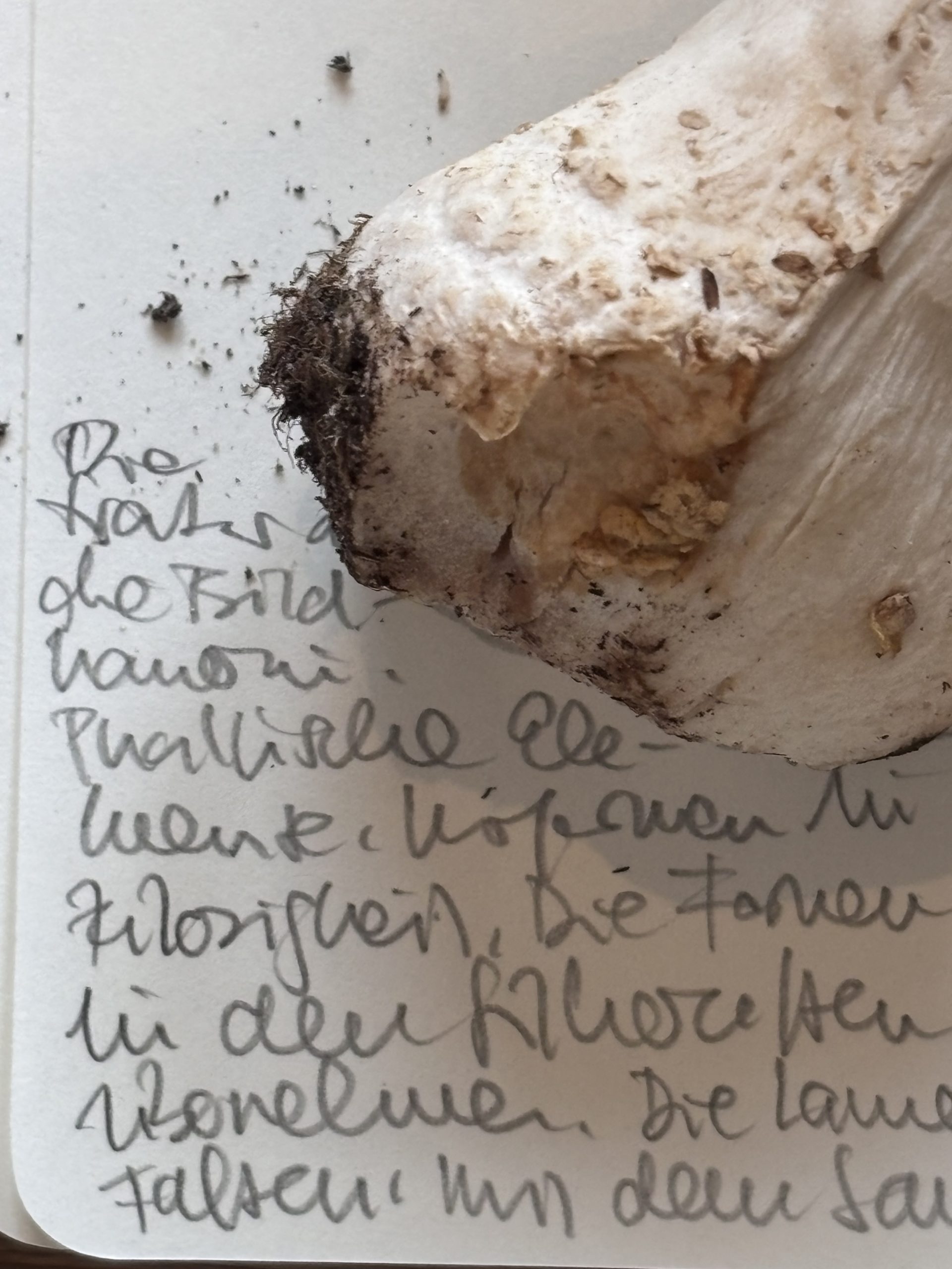 Vorsichtig nähere ich mich ihm, ziehe als Erstes mit dem Bleistift eine Linie um seinen Schatten, den das Licht von draußen geworfen hat. Wie eine Detektivin versuche ich den Standort zu sichern. Anschließend beginne ich, ihn in seinen Bestandteilen zu studieren, kenne mich nicht aus, habe keine Ahnung von Pilzen.